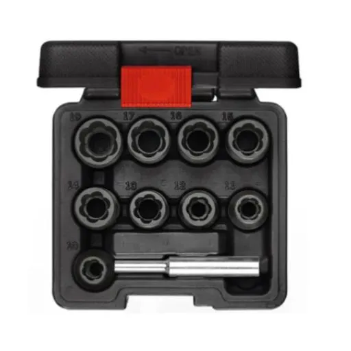 Set de dados extractores de pernos rodados cuadrante de 1/2 pulgada. este juego contiene 10 piezas e incluye las siguientes medidas: 10,11,12,13,14,15,16,17 y 19 mm.